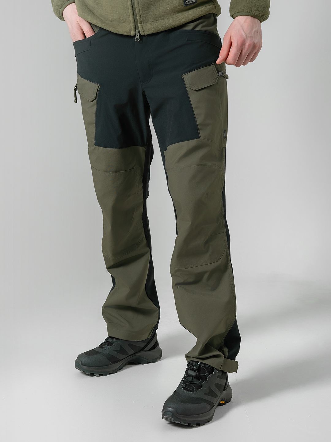 В общей сложности шесть карманов: два классических передних кармана с усиленными краями для снаряжения на клипсе, два боковых набедренных карго-кармана на молнии и два интегрированных с ними передних кармана на бёдрах с клапанами на липучке..