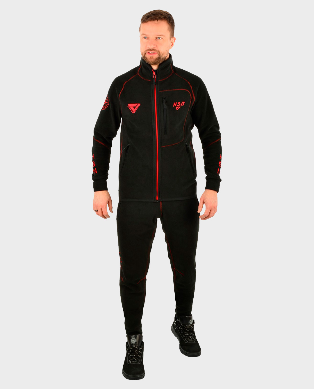 Костюм состоит из куртки и брюк. На куртке 3 удобных кармана на молнии. Брюки с завышенной талией на широкой резинке, для предотвращения продувания спины и переохлаждения. Так же на брюках удобные карманы на молниях. В комплекте к костюму идет поясной ремень с пряжкой — Fastex.