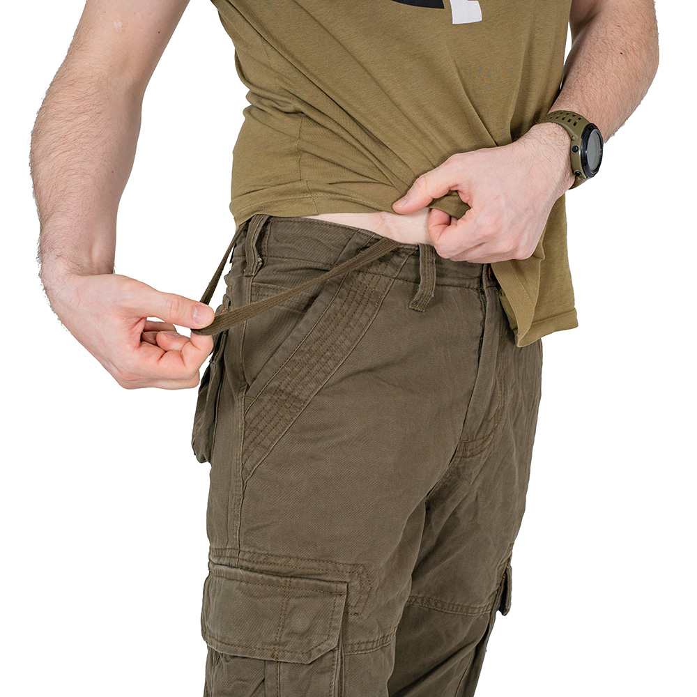 Модель имеет множество карманов. Спереди расположены два кармана с отрезным бочком сверку и два накладных набедренных кармана с клапаном на кнопка. Сзади два накладных кармана с клапаном на кнопках. Ширинка на молнии, сверху пуговица. На поясе пришиты шлевки под ремень шириной до 5 см.