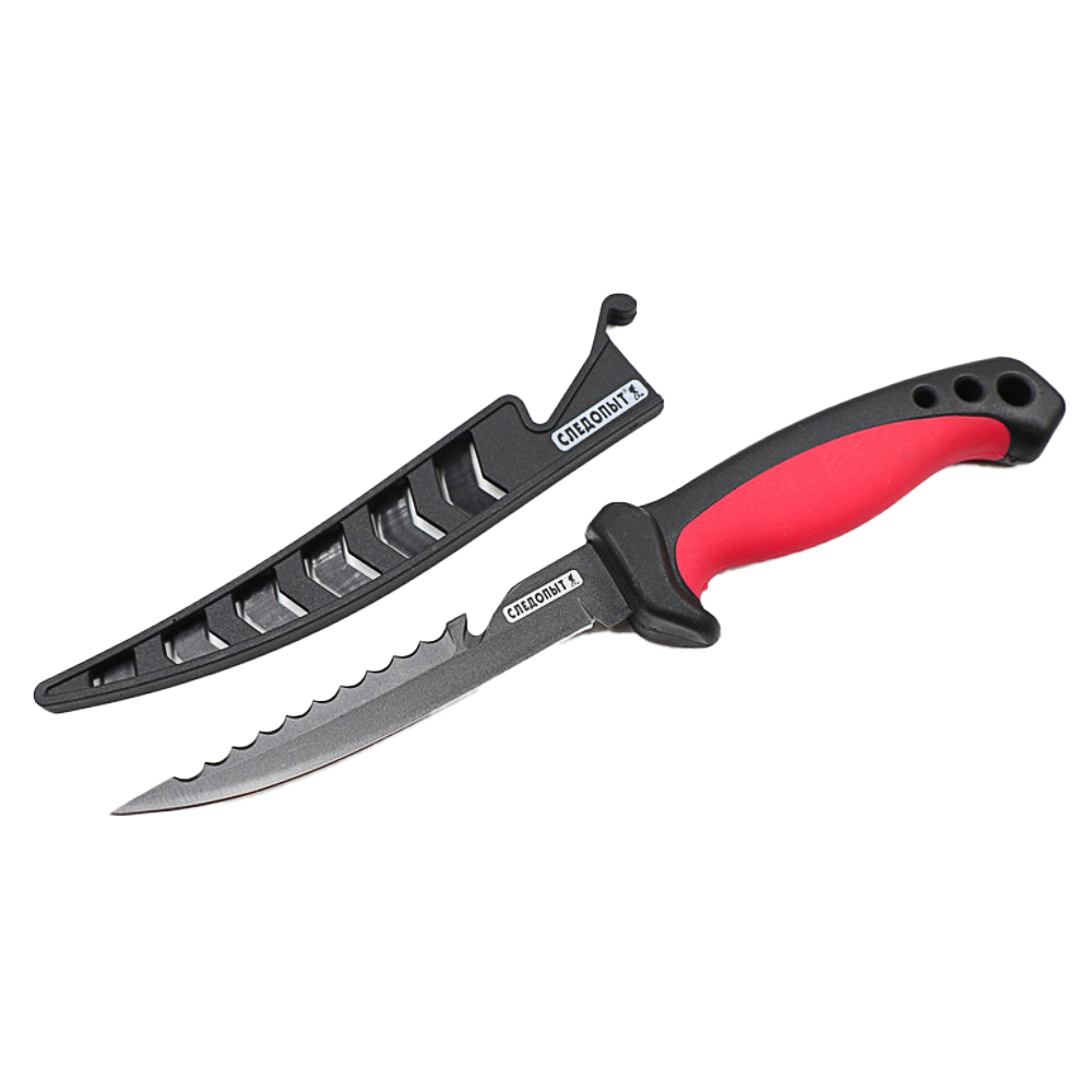 В комплекте с ножом поставляется облегченный пластиковый чехол-ножны, повторяющий форму лезвия, с фиксатором на ручке. Предназначен для охотников, рыбаков,может быть использован ина домашней кухне.